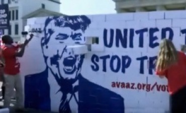 Activistas erigieron y tiraron una pared ante la Puerta de Brandeburgo para que los estadounidenses que viven en el exterior voten contra el republicano.
