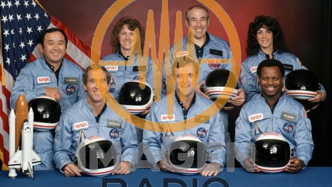 La tripulación del Challenger: Comandante Francis Scobee, el Piloto el Comandante Michael Smith y los especialistas de misión: el Dr. Ronald McNair, el Teniente Coronel Ellison Onizuka, la Dra. Judith Resnik y el compañero especialista de carga Gregory Jarvis.