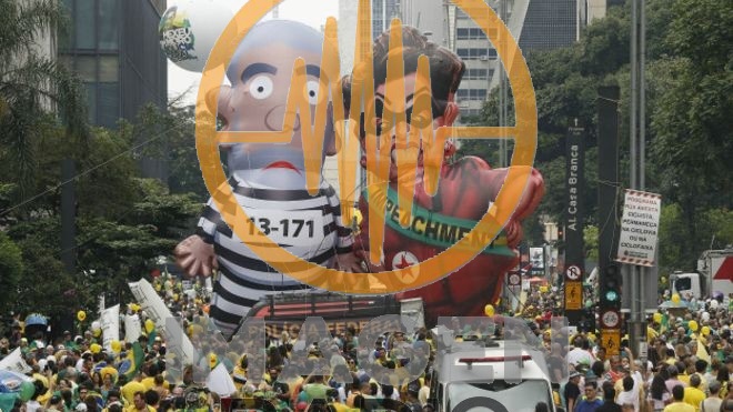 En Sao Paulo, grandes muñecos inflables de la presidente Rousseff llevaban una faja diciendo "juicio político" y de Lula, vistiendo ropa de la prisión desfilaron por las calles.