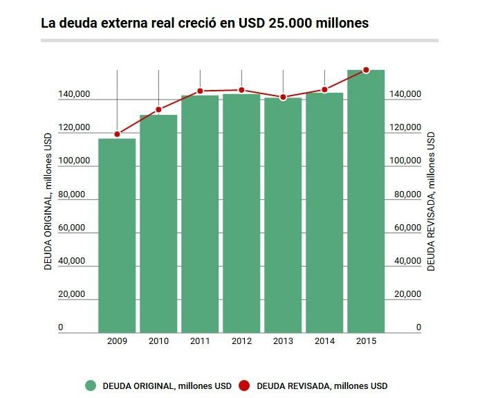 El último dato de la deuda externa del sector público en su conjunto actualizado por la Secretaría de Finanzas era a fines de junio de 2015 de USD 79.808 millones, pero esas cifras fueron revisadas a USD 82.501 millones por parte del equipo que acompaña en el organismo oficial de estadística a cargo de Jorge Todesca, integrado por Fernando Cerro en la Dirección Técnica y Pedro Lines en la Dirección Nacional de Cuentas Internacionales.