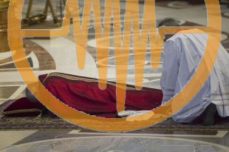 El Pontífice había comenzado la ceremonia totalmente tumbado en el suelo, con la cara sobre un almohadón, postrado como señal de adoración a la Cruz que ocupaba la nave central de la Basílica.