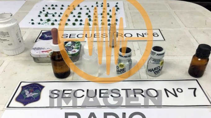 Además, se incautaron dosis de LSD, marihuana en 77 cigarrillos y en frasco de plástico, cocaína, Popper contenido en 6 frascos de vidrio, 2 celulares y dinero en efectivo.