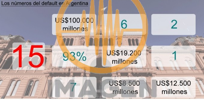 - 15 son los años que duró el 'default' en Argentina. La cesación de pagos se declaró el 23 de diciembre de 2001 y nuevamente en 2014, cuando un juez en EE.UU. prohibió que Argentina le pagase a sus acreedores si antes no saldaba la deuda con los llamados 'fondos buitre'.