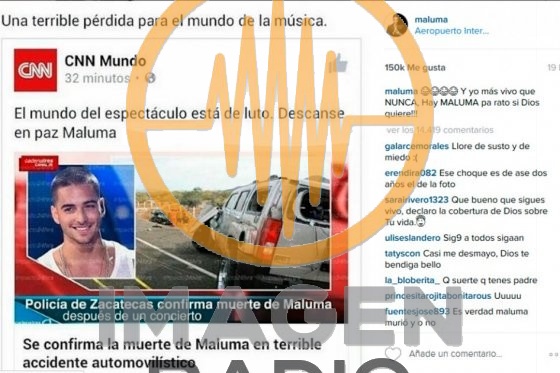 Maluma tuvo que desmentir la noticia de su muerte en las redes socialesdespués de que una cuenta de Instagram llamada CNN Mundo, que no está relacionada de ninguna forma con la cadena de televisión, anunciara que había fallecido en un trágico accidente de tráfico en Zacatecas (México) tras ofrecer un concierto.