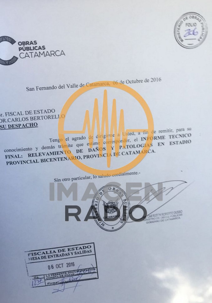 El Ministerio de Obras Públicas recibió el informe final elaborado por expertos de la Universidad Nacional de Tucumán sobre el Estadio Bicentenario, documento que fue formalmente presentado en Fiscalía de Estado.