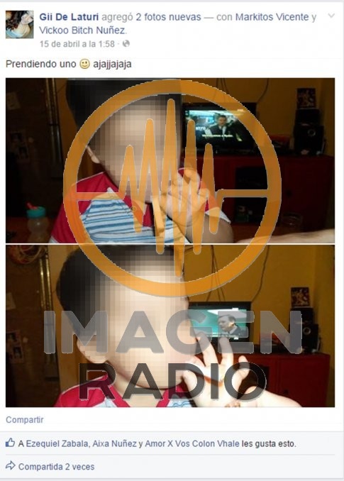 Al compartir las fotos, la joven madre, que vive en La Pampa, además de "celebrar" que su pequeño hijo está fumando un cigarrillo escribió en su cuenta de Facebook otro mensaje en el mismo sentido: Más lindo mi hijo. Es el tío Juan que le da cigarrillos.
