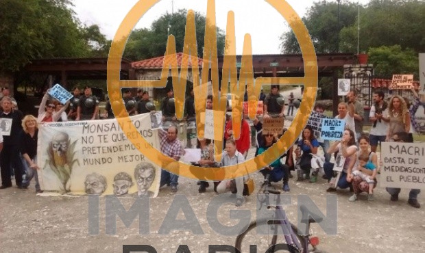 Con consignas anti-Monsanto, militantes contra la contaminación agroquímica exhibieron pancartas y carteles frente a un muro de gendarmes que custodiaron las puertas del lugar.