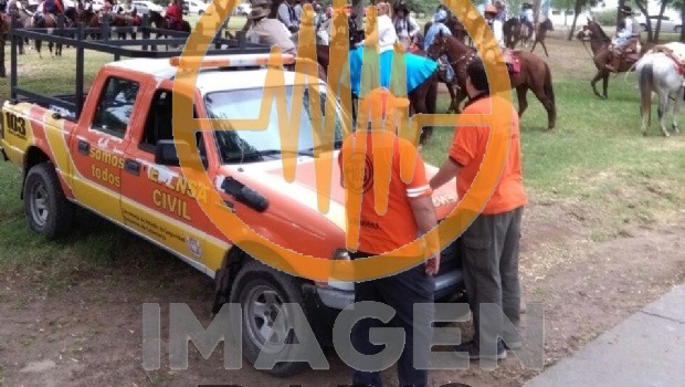 Defensa Civil brindó agua mineral a los gauchos a caballo durante el recorrido de la caravana hasta el Parque Adán Quiroga, donde se ofició la Santa Misa.