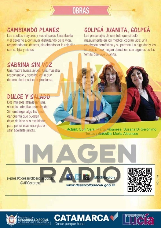Es por ello que durante la jornada de hoy el Cine Teatro Catamarca será testigo del programa nacional “Argentina Creativa” con obras de teatrales denominadas “Teatros de la Vida Cotidiana”, donde se incluyen las presentaciones nacionales de las actrices Coni Vera, Marta Albanese y Susana Di Gerónimo. El evento será solo por hoy, jueves 14 de mayo de 9 a 11hs y por la tarde de 15 a 17 y la entrada totalmente gratuita.