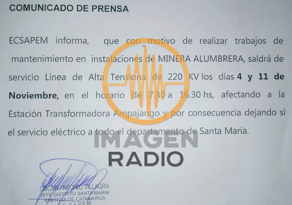 Ec Sapem informa que el servicio se verá afectado durante varias horas, el Motivo mantenimiento en las Instalaciones de la Minera ALUMBRERA