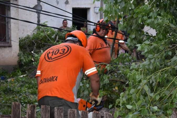 Personal de Defensa Civil junto con EC SAPEM se encuentran trabajando en distintos puntos de la Capital y Valle Viejo para retirar árboles, ramas y chapas que volaron con el fuerte viento de esta tarde, además de levantar postes caídos para restablecer el servicio de energía eléctrica en varias zonas. Solicitamos llevar tranquilidad a la población, ya que se está auxiliando a las familias que resultaron más afectadas.