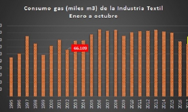 Respecto de 2015, la caída del consumo de gas, en la industria textil, en el acumulado enero-octubre de 2018, fue de un 25,8% menos de gas que en igual período de 2015.