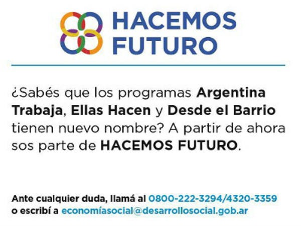 Programa Hacemos Futuro, el nuevo programa nacional que fusiona tres planes, los cuales son “Con Ingreso Social de Trabajo”, “Ellas Hacen”, “Argentina Trabaja” y “Desde el Barrio”.