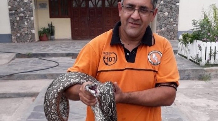 Personal de Defensa Civil devolvió a su hábitat natural una víbora lampalagua que fue capturada en la escuela de Las Tejas, departamento Valle Viejo.