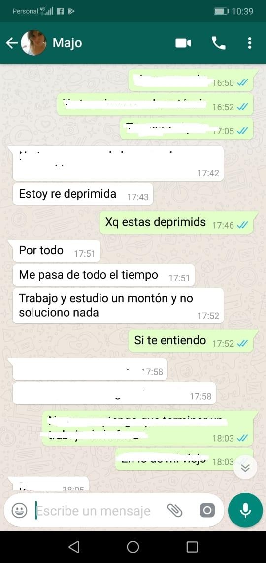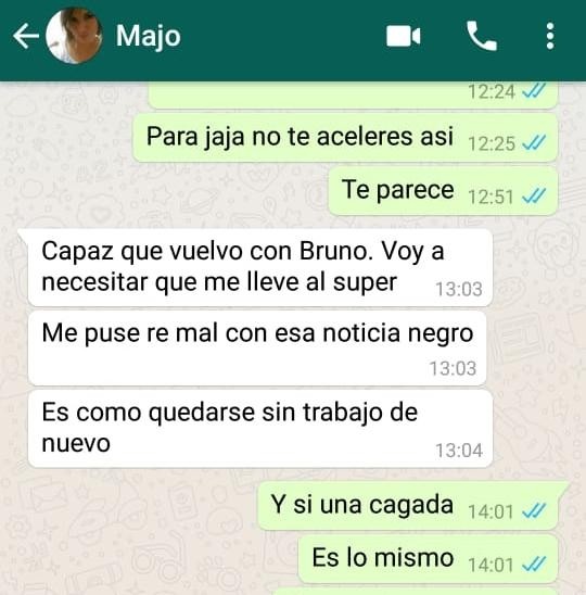 Sin un peso en el bolsillo, con un niño a cuestas, Majo escribió un ms de whatsapp que estaba desesperada, que no tenía nada para poner en la heladera y que eso la obligaba a volver con Bruno, su ex novio, quien la ayudaba económicamente pero le hacía pagar con un alto precio de violencia y sometimientos.
