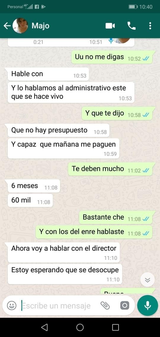 Un llamado para trabajar en el Ministerio de Educación que conduce Daniel Gutierrez alimentó de nuevo sus esperanzas de una salida a su pobreza. Así, con sus ilusiones a cuestas, comenzó a prestar servicios durante 6 meses…nunca los cobró. Pocas semanas antes del fatal desenlace, Majo relataba que se había cansado de tramitar ese cobro y que solo recibió como respuesta un “no hay presupuesto” de un administrativo que “se hace el pícaro”.