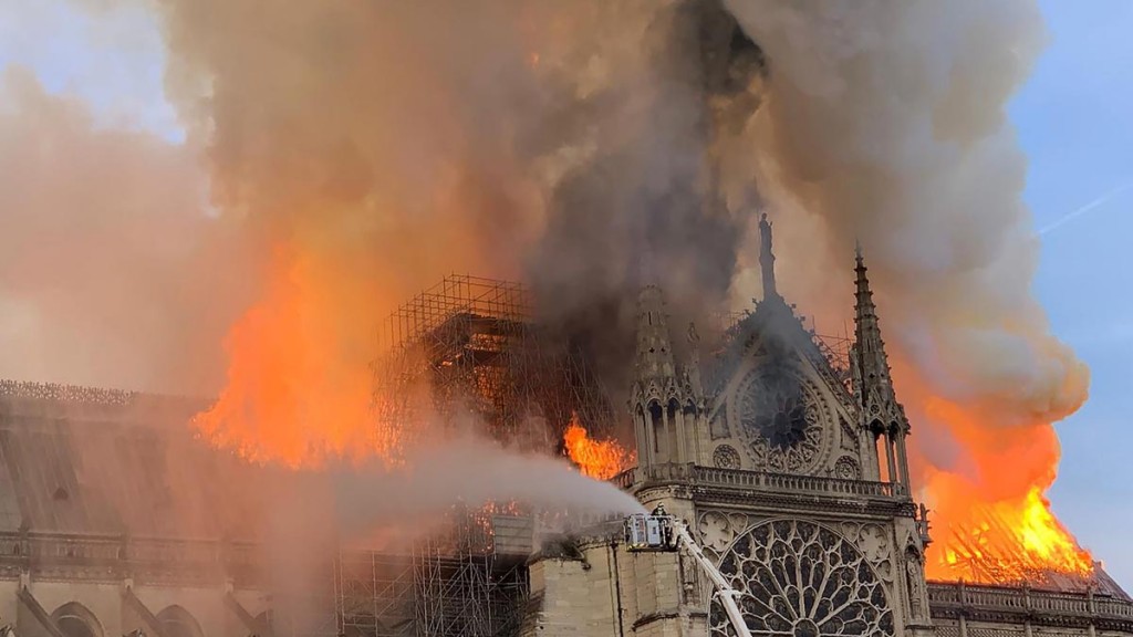 En las imágenes se vio también cómo se desmoronaba después la aguja central, una torre añadida en el siglo XIX al templo medieval y que en la actualidad estaba rodeada de un andamiaje por obras de reparación.