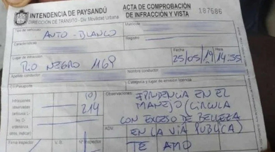 Un agente de tránsito de Paysandú, Uruguay, multó a una conductora pero, cuando sus superiores descubrieron qué había escrito en el documento, se encendieron las alarmas.