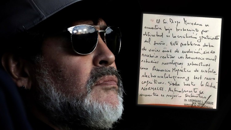 En las últimas horas se filtró un documento revelador: el diagnóstico oficial de la salud de Maradona, que confirma lo publicado por Infobae. El mismo, firmado por el doctor Leopoldo Luque, matrícula N° 160583, especialista en neurocirugía, señaló que "el señor Diego Maradona se encuentra bajo tratamiento por dificultad en la conciliación y mantenimiento del sueño. El problema data de varios años de evaluación, siendo necesario realizar con frecuencia anual estudios neurológicos exhaustos, como resonancia magnética, electroencefalograma y test neurocognitivo, siendo hasta la fecha NORMALES (así, en mayúsculas). Actualmente se encuentra en mejoría sintomática".