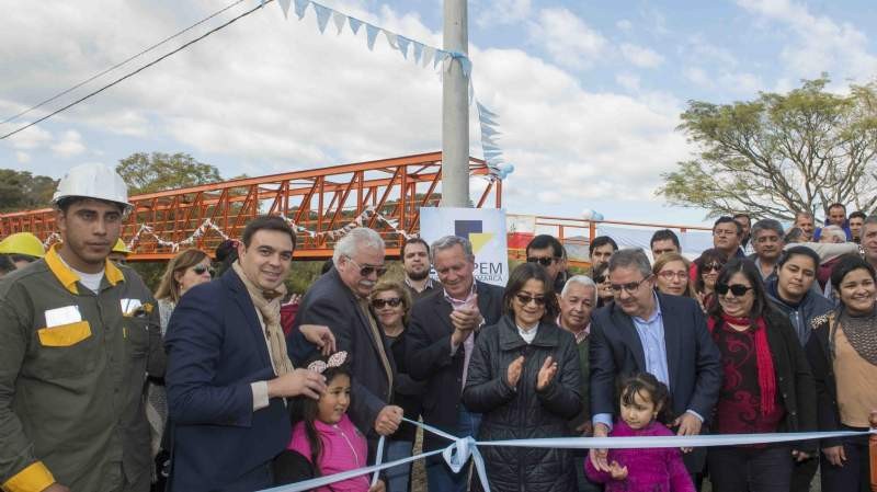 Acompañaron a la mandataria el intendente Rafael Olveira; los ministros de Obras Públicas, Rubén Dusso; de Producción, Daniel Zelarayán; el presidente de la EC Sapem, Raúl Barot; el intendente de funcionarios municipales, entre otros. En su recorrido, Corpacci inauguró en primer término la pasarela metálica sobre el Río La Aguada, obra realizada por la Subsecretaria de Recursos Hídricos del Ministerio de Obras Públicas. Se trata de una pasarela con una longitud de 40 mts y un ancho de 2 metros, accesible tanto para las personas con bicicletas y motos. No tiene punto de apoyo intermedio y comunica ambas márgenes del río. Cuenta con gaviones y colchonetas como defensa de la misma.