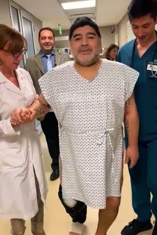 "Hoy volví a caminar como cuando tenía 15 años. Muchas gracias a mi cirujano @Dr.Eyharchet, y a todos los que me cuidan en la #ClinicaOlivos", celebró Maradona.