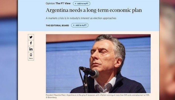 En el artículo se destaca que la preocupación más apremiante de la Argentina —luego de la devastadora derrota del presidente Mauricio Macri en las elecciones primarias— es evitar una crisis monetaria y una crisis de la deuda. "Los primeros signos no son alentadores. El peso se desplomó un 22% en las operaciones de apertura el lunes y los rendimientos de los bonos del país aumentaron bruscamente. Los recuerdos de la administración de Cristina Fernández y de su esposo, Néstor Kirchner, que incluyeron controles de precios, nacionalización de empresas e incumplimiento de la deuda del país, siguen siendo fuertes", se describió en la nota firmada por el equipo editorial del Financial Times.