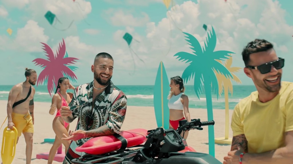 Las  imágenes muestran a Maluma y Ricky Martin bailando y cantando en una playa rodeados de mujeres en traje de baño.