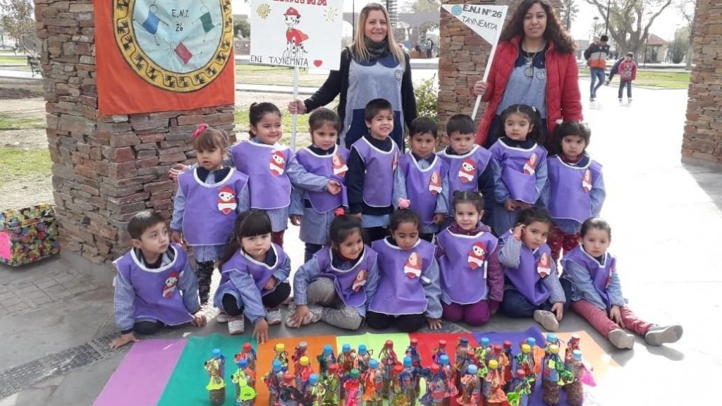 Cuando las docentes propusieron la actividad los niños mostraron rápidamente su entusiasmo, comenzaron a llevar botellas de medio litro que lavaron y les colocaron una imagen que pintaron con témperas. Luego, las rellenaron con el alimento que cada padre aportó. Además a ellos les gustó tanto la idea que hicieron una bandera con el nombre del ENI y del grupo para que portaran cuando salieran a recorrer las calles en las diversas actividades.