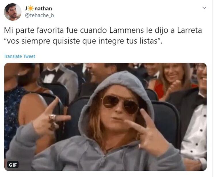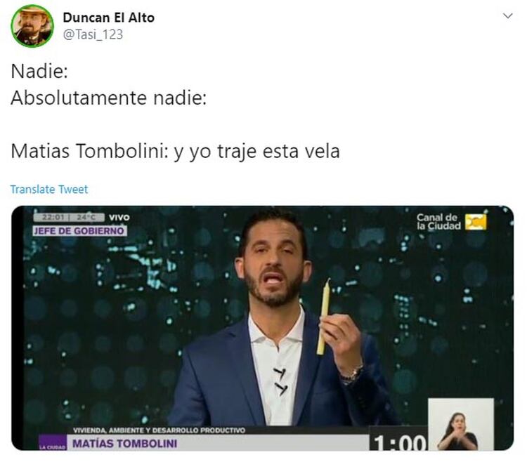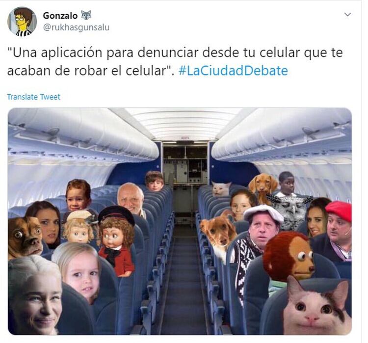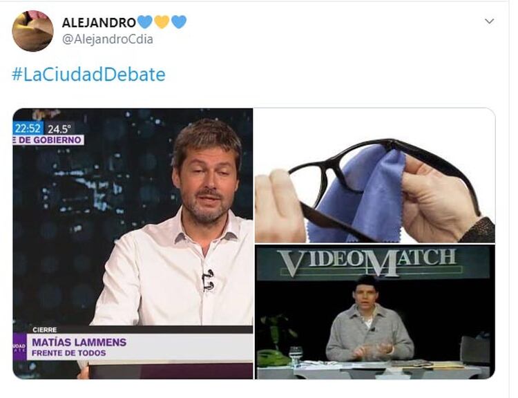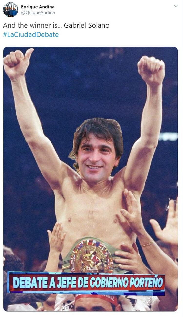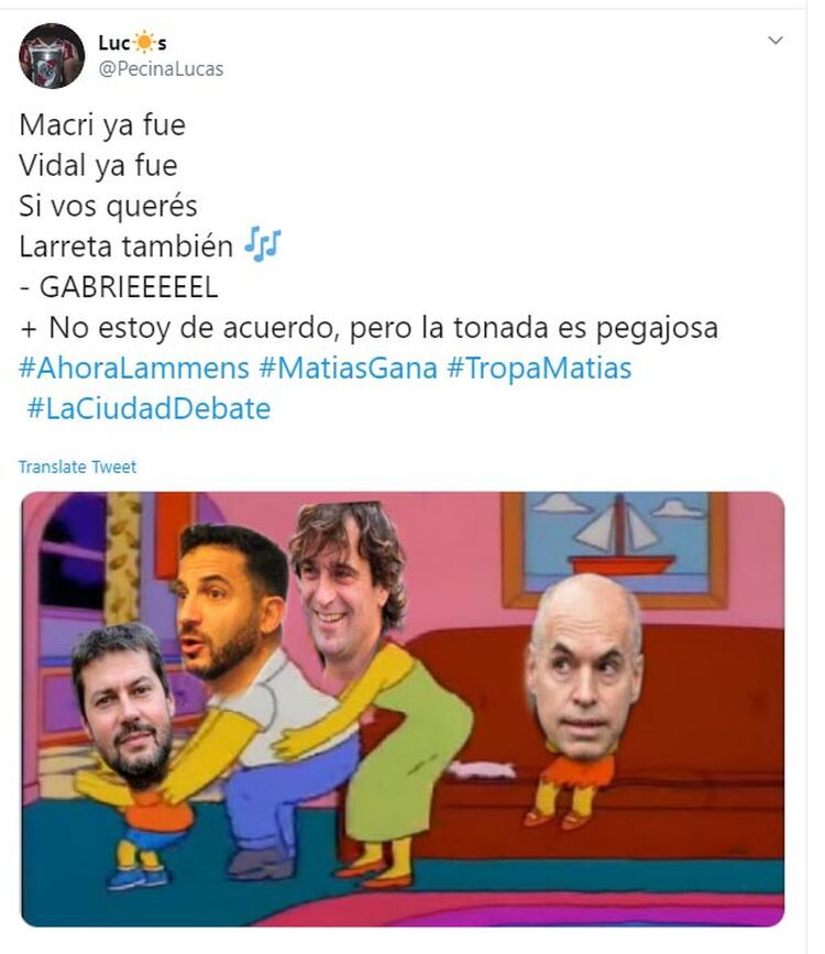 Mientras que en el debate de los candidatos a jefe de Gobierno de la Ciudad de Buenos Aires hubo pocos cruces y principalmente sirvió para que los referentes de los distintos partidos expongan su plataforma electoral, los espectadores se volcaron a las redes sociales y, a través de cientos de memes, hicieron referencia a la performance que mostraron Horacio Rodríguez Larreta, Matías Lammens, Matías Tombolini y Gabriel Solano. Los usuarios de Twitter polarizaron el debate al tener como blanco de sus críticas y burlas a los candidatos de Juntos por el Cambio y del Frente de Todos, quienes formaron parte de los momentos destacados de la noche. El jingle adoptado por el Frente de Todos para intentar forzar una segunda vuelta y eventualmente vencer a Rodríguez Larreta no podía faltar. En este caso también se apuntó al dirigente de izquierda Gabriel Solano. Un meme para ser leído con el tono y estilo de voz del ex campeón del mundo con la Selección Argentina de Fútbol, Oscar Ruggeri, dirigido a la exposición que tuvo Lammens. Al candidato del Frente de Todos también se lo comparó con Marcelo Tinelli, vice presidente de su gestión al Frente de San Lorenzo. La mayoría de los tuits tuvieron como protagonista a Lammens, ya sea por sus propuestas o sus chicanas a Rodríguez Larreta. “Muchas veces quisiste que sea candidato de tus listas y que me integre a tu gestión”, cruzó el candidato del Frente de Todos al actual jefe de gobierno. Gabriel Solano fue protagonista de un insólito momento cuando el periodista que oficiaba como moderador del debate, Guillermo Andino, olvidó mencionar al dirigente de izquierda. En menor medida, Tombolini también fue víctima de los divertidos memes que circularon por las redes sociales con el hashtag #LaCiudadDebate que se convirtió en tendencia. Seguí leyendo: