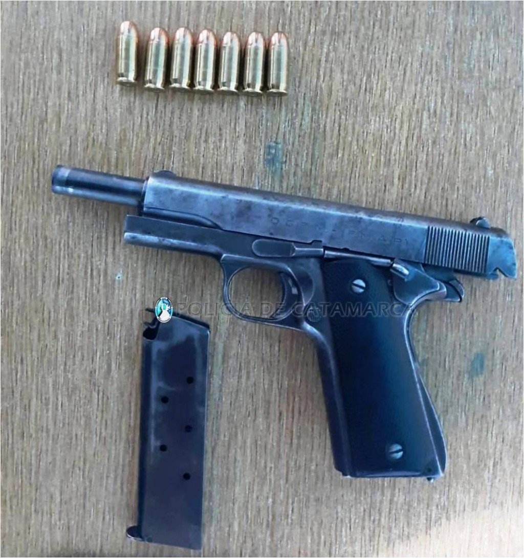 Mientras el local era desalojado, los efectivos requisaron al foráneo, quien tenía en la cintura el arma descripta por los testigos.  Se trata de una pistola 11,25 Ballester Molina, similar a la que utiliza la Policía, la que estaba cargada en la recámara y tenía, además, siete municiones en el cargador.