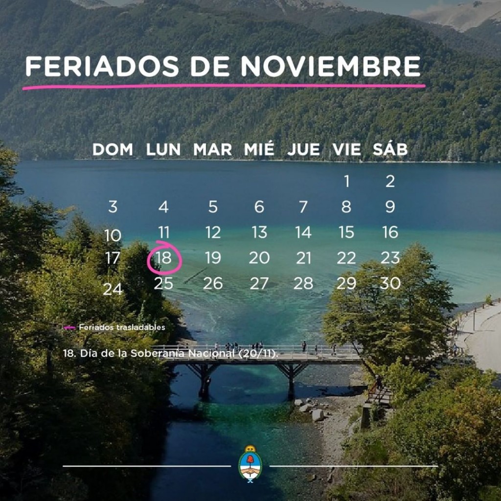 Faltando solo dos meses para concluir el 2019, en noviembre habrá sólo un feriado. El mismo corresponde al Día de la Soberanía Nacional, que se celebra el 20/11, aunque se trasladará al lunes 18 de noviembre.