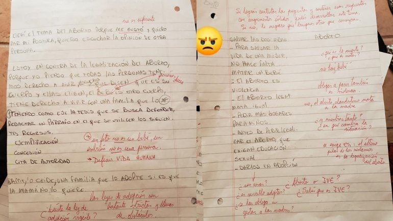 Una alumna realizó un trabajo práctico sobre la interrupción del embarazo y las correcciones del docente generaron una fuerte disputa en las redes.