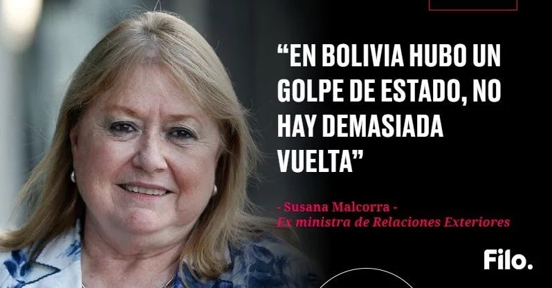 "Acá hubo un golpe de Estado, no es una cuestión debatible, es un golpe de Estado liso y llano. La región supo decirle 'Nunca Más' a los golpes, me parece peligroso que ahora se pongan consideraciones en torno al golpe en Bolivia", dijo Malcorra esta mañana en declaraciones a FM Futurock y radio La Red.