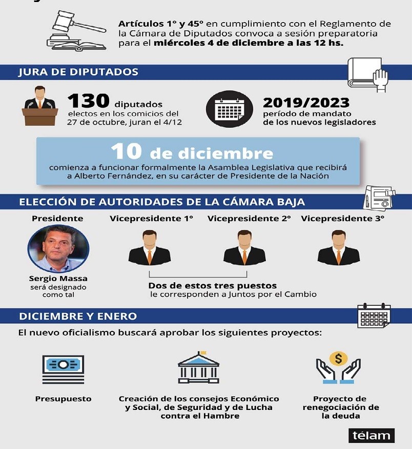 La Cámara de Diputados realizará hoy la sesión preparatoria del cuerpo, donde se tomará juramento a los diputados electos en los comicios del 27 de octubre y se designará a sus autoridades, entre ellas al líder del Frente Renovador, Sergio Massa, que será consagrado como presidente del cuerpo a partir del 10 de diciembre, en reemplazo de Emilio Monzó, que concluye su mandato.