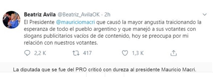 Tras el comentario del mandatario nacional, fue Beatriz Ávila quien optó por contestarle por medio de su cuenta personal de Twitter. “El Presidente @mauriciomacri que causó la mayor angustia traicionando la esperanza de todo el pueblo argentino y que manejó a sus votantes con slogans publicitarios vacíos de de contenido, hoy se preocupa por mi relación con nuestros votantes”.