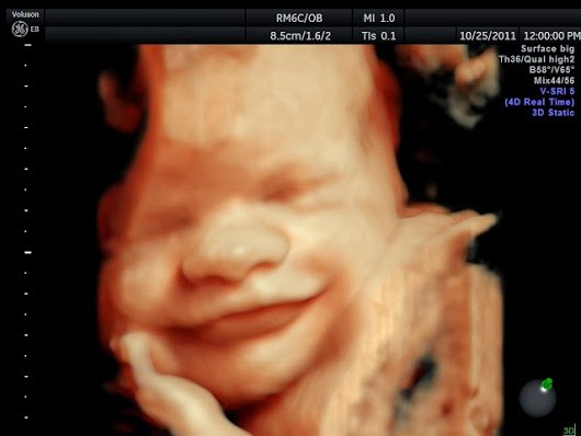 El llanto puede percibirse en las ecografías, ya que el labio inferior del bebé tiembla. También puede reír, ya que a partir de la semana 28 de embarazo el niño ya empieza a gesticular. Ambas expresiones, junto con el bostezo, serán las más habituales que se perciban en él una vez nazca.