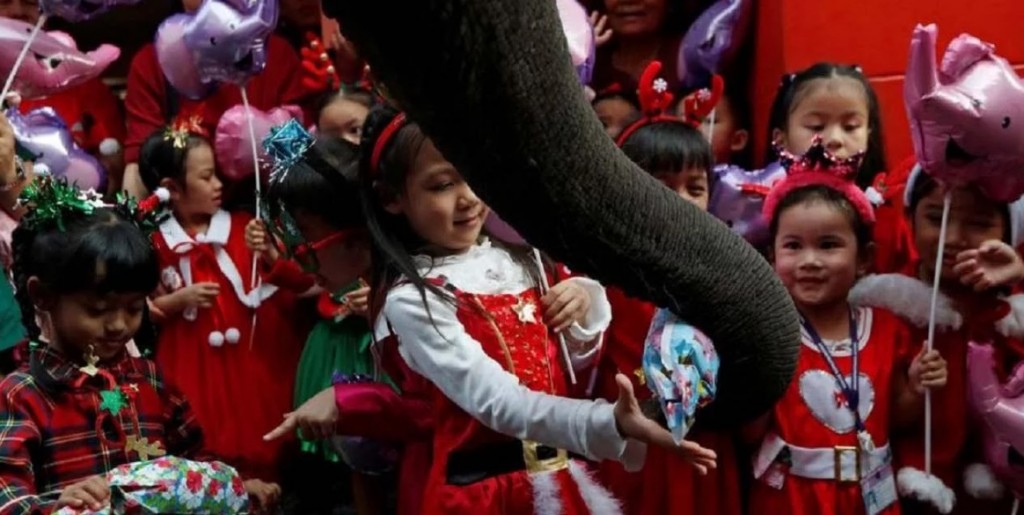 Los alumnos de una escuela en Tailandia recibieron una visita muy especial para estas fiestas. En vísperas del 25 de diciembre, cuatro elefantes vestidos como Papá Noel llegaron a la institución y comenzaron a repartir regalos y golosinas. La visita formó parte de una tradición anual navideña que destaca en un país en el que la mayoría de la población es budista.