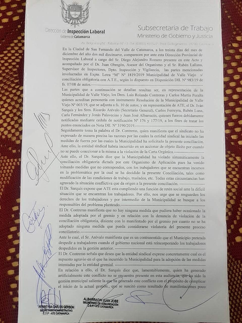 A la reunión asistieron, por parte del Municipio, el Secretario de Gobierno, Dr. Rolando Contreras y el Secretario Legal y Técnico, Dr. Martín Peralta, y por el gremio de ATE, el Secretario General, Ricardo Arévalo, el apoderado legal, Dr. Iván Sarquís y los delegados de Valle Viejo.