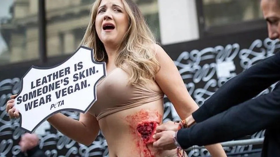 Con maquillaje y efectos especiales, Lydia Smyth, de 25 años, simuló sufrir un "desgarrador dolor" mientras era "despellejada" por una persona, como también se supone le sucede a los animales. La mujer, lo hizo frente a los asistentes a la semana de la moda que se realizó del 14 al 18 de febrero, aunque las imágenes de la "sangrienta" protesta se dieron a conocer recientemente.