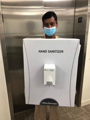 Por temor al coronavirus, una empresa obligó a un trabajador a vestirse como un dispensador de alcohol en gel para manos.