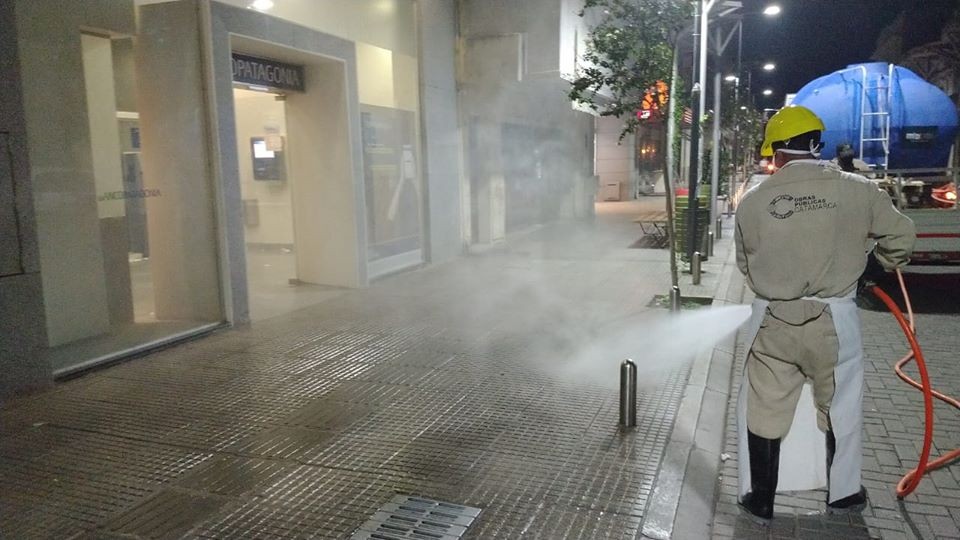 Desde el Ministerio de Infraestructura y Obras Civiles se está trabajando en un novedoso método de prevención contra la lucha del coronavirus.   Se trata de un trabajo de desinfección mediante un camión regador de última generación propiedad del ministerio, adaptado con una bomba pulverizadora para tal fin.   De esa manera, personal a cargo trabaja en horas de la noche realizando la desinfección mediante un regado y pulverizado de una mezcla de agua y lavandina en calles, veredas, frentes de los inmuebles, como también en los desagües y alcantarillaras de la peatonal.