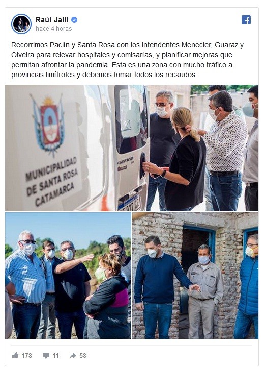 Esta mañana, el gobernador Raúl Jalil desarrolló una intensa agenda de actividades oficiales, que lo llevó por los departamentos Paclín y Santa Rosa, para relevar hospitales y comisarías, y planificar mejoras que permitan afrontar la pandemia.