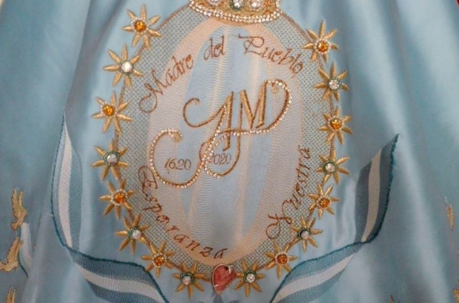 La prenda fue confeccionada por las Monjas Dominicas y demandó nueve meses. Entre los detalles se destaca una lágrima de rodocrosita, rodeada de cristal y perlas blancas como signo y ofrenda de tanto dolor por la pandemia.