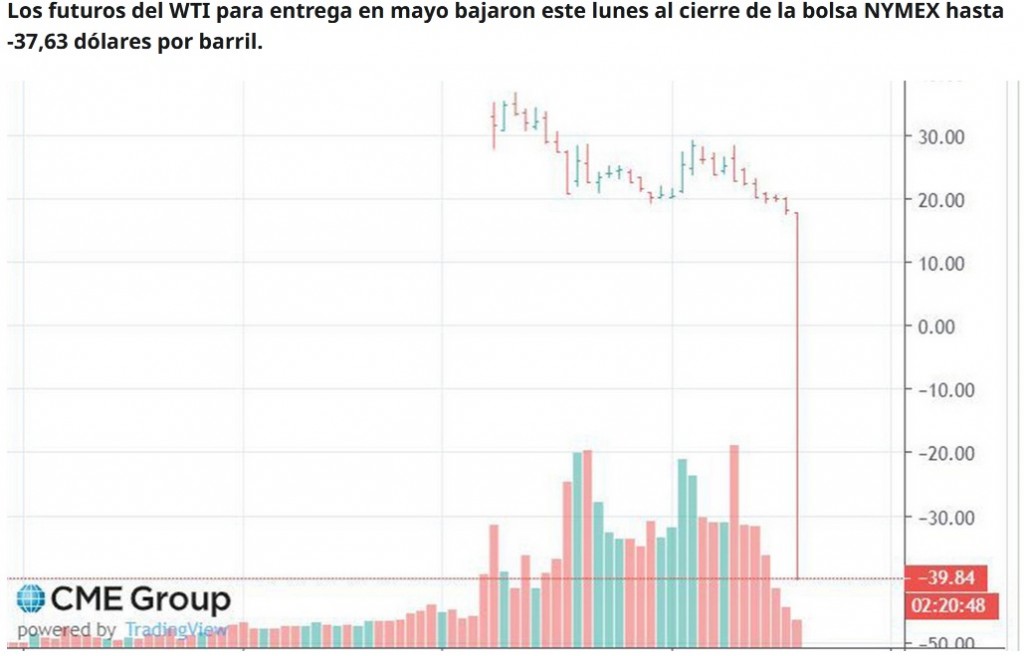 Los futuros del WTI para entrega en mayo bajaron este lunes al cierre de la bolsa NYMEX hasta -37,63 dólares por barril.
