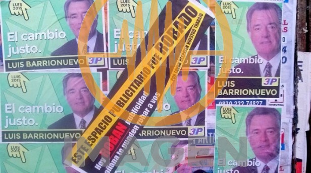 El precandidato a gobernador por el Frente Tercera Posición (F3P), Luis Barrionuevo, reimpulsó su campaña electoral con vistas a los venideros comicios con la pegatina de renovados afiches, aunque –aparentemente- en espacios que no le pertenecerían, como lo denuncian otros carteles superpuestos a los suyos, denunciando un “robo”.
