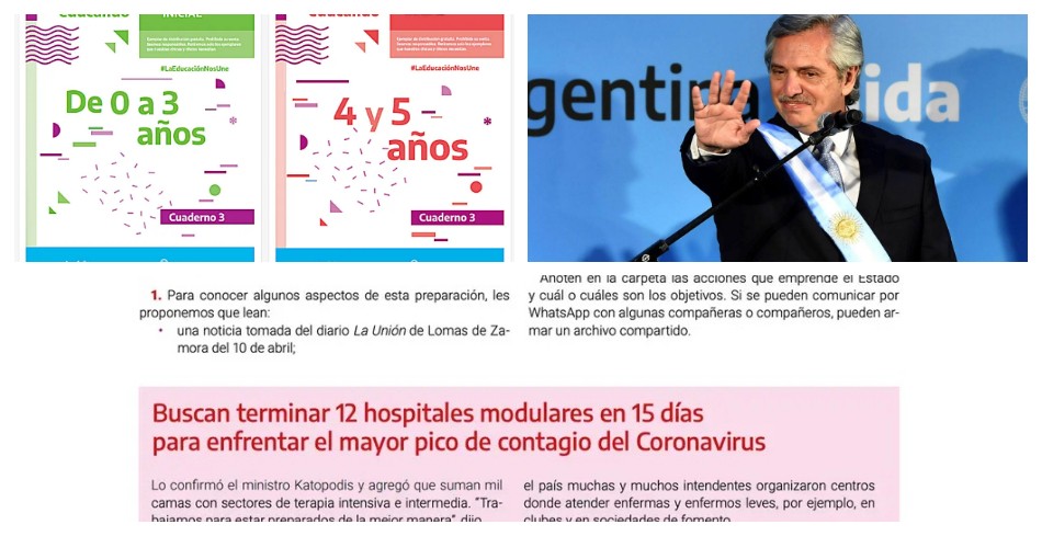 El Ministerio de Educación desembolsó $406 millones entre marzo y abril para imprimir 18 millones de cuadernillos educativos con el propósito de mantener contacto con alumnos de la escuela pública durante la cuarentena. El material didáctico incluye contenidos políticos y difusión de obras del Gobierno los chicos de 2ndo y 3er grado deben leer una nota periodística del diario Página 12 medio oficialista.