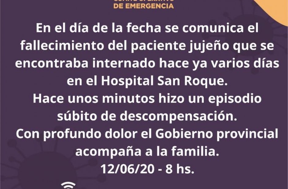 El pasado 2 de junio el gobernador Gerardo Morales y el doctor Omar Gutiérrez informaron que la salud de esta persona se había deteriorado por una insuficiencia respiratoria, por lo que los médicos lo ingresaron a terapia intensiva. Hoy se conoció la noticia de su fallecimiento.