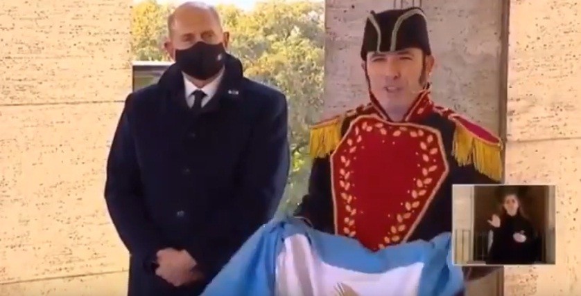 “Muy conmovido, muy emocionado que sean ustedes, los argentinos, las argentinas, que hayan prometido por esta bandera que es de todas, todos y todes”, expresó simulando al prócer argentino, a 200 años de su muerte.