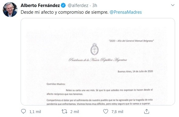 Un rato después de que Fernández publicara la carta en sus redes sociales, la cuenta de las Madres de Plaza de Mayo en Twitter dio por terminada la controversia: “Su respuesta nos alienta a seguir luchando”, publicó el usuario @PrensaMadres.