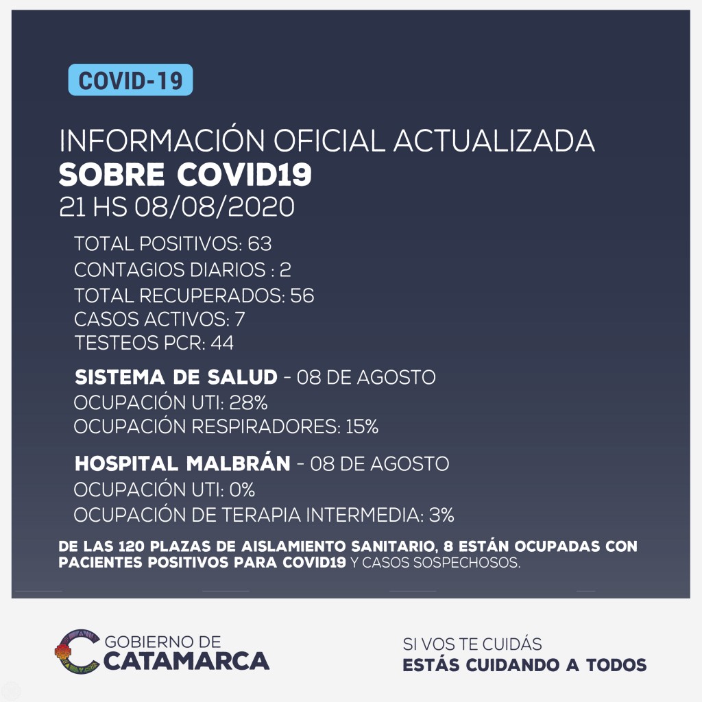 Hasta las 21 horas del sábado 8 de agosto, se han detectado 2 nuevos casos positivos de coronavirus en la provincia de Catamarca. El total acumulado de casos positivos detectados se mantiene en 63. Hoy no se registraron nuevos pacientes recuperados.